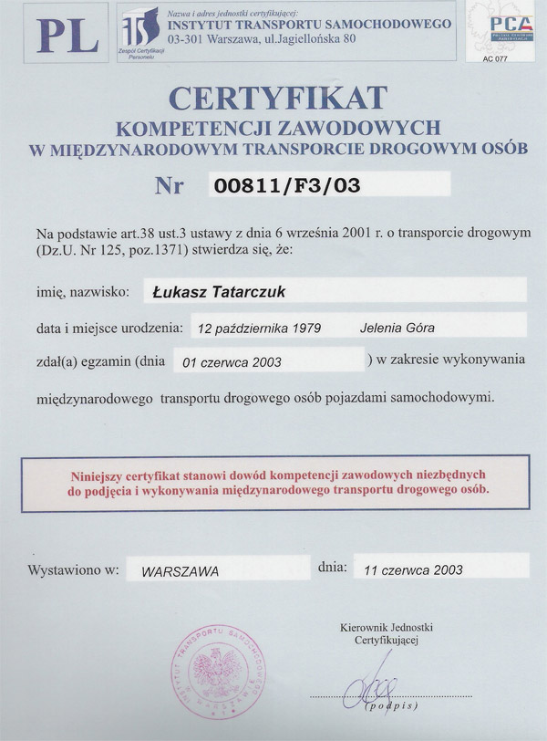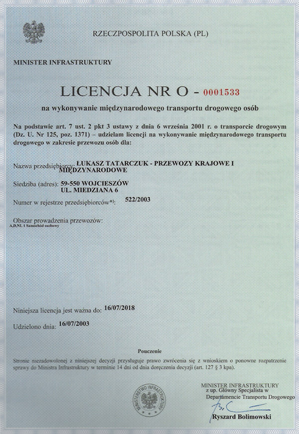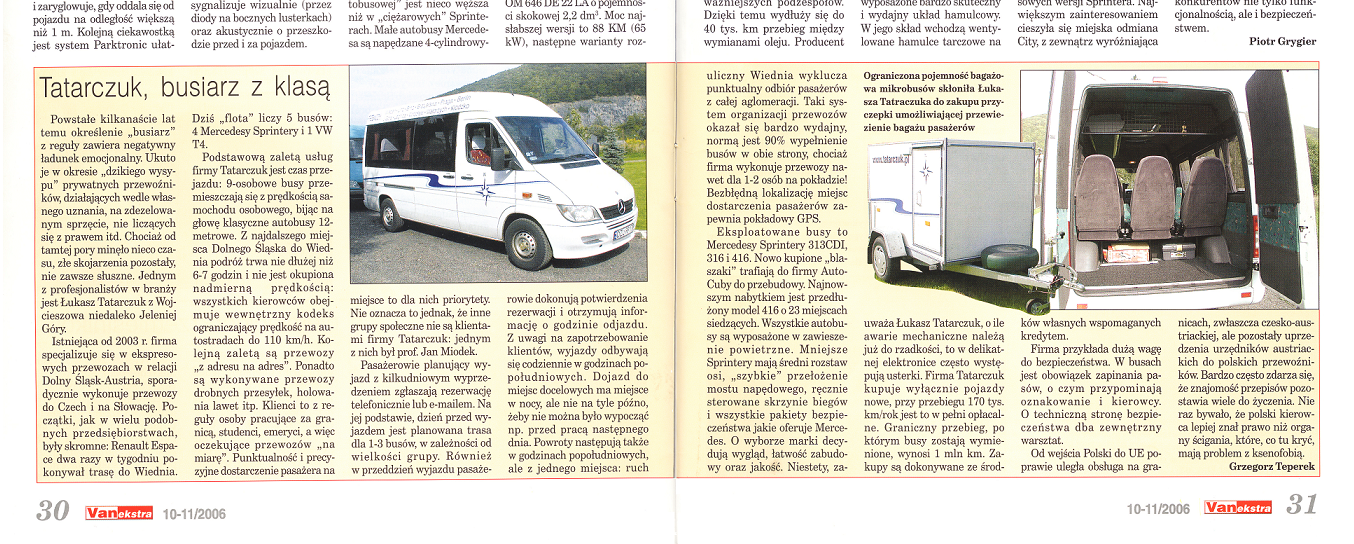 Posiada wszelkie niezbędne uprawnienia, jest firmą ekspansywną nastawioną na ciągły rozwój. Dba o bezpieczeństwo i wygodę swoich pasażerów. Dysponuje pojazdami przystosowanymi do długich podróży, uwzględnia indywidualne życzenia i oczekiwania klientów. Zatrudnia kierowców z wysokimi kwalifikacjami a usługi przewozowe świadczy tanio, solidnie i punktualnie. Mając powyższe na uwadze a także znając wagę reklamy nie unikamy rozpowszechniania naszej działalności w ogólnodostępnych mediach czego dowodem jest np. nasza strona internetowa, ogłoszenia prasowe, plakaty reklamowe, wizytówki itp. Chętnym do zapoznania się z funkcjonowaniem firmy "od kuchni" polecamy artykuł zamieszczony w miesięczniku Van Extra zatytułowany "Tatarczuk, busiarz z klasą".
