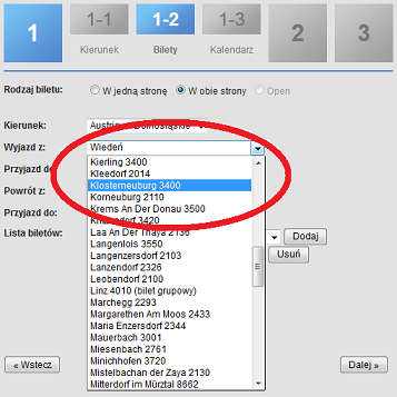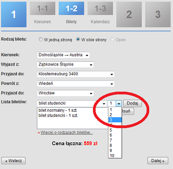 Po wyborze rodzaju biletu zaznacz ich ilość a następnie kliknij "Dodaj". W każdej chwili możesz usunąć wybrany bilet. W naszym systemie on-line jesteś informowany na bieżąco o łącznej cenie za wybrane bilety. Jeśli potrzebujesz informacji o rabatach kliknij "Więcej o rodzajach biletów..". Aby wybrać datę podróży kliknij "Dalej":