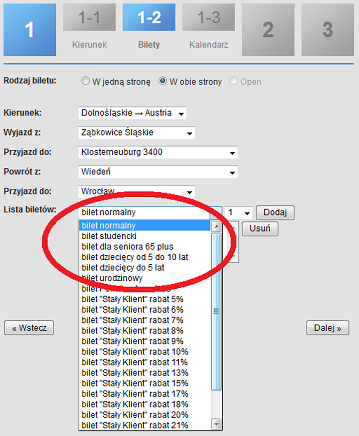 Wybierz z listy rodzaj biletu. Tylko u nas w systemie on-line dostajesz bilety z rabatami nawet do 50%: