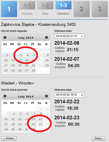 Na kalendarzu określ datę wyjazdu i powrotu. System on-line poinformuje Cię o godzinach odjazdu i dotarcia do celu. Jeżeli nie możesz wybrać daty oznacza to że w systemie on-line na dany dzień nie ma już wolnych miejsc. Prosimy wówczas o kontakt telefoniczny. Aby wpisać dane nabywcy biletów kliknij "Dalej":