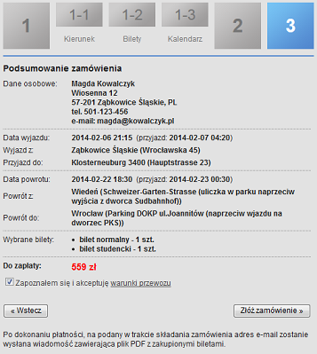 Sprawdź w podsumowaniu wszystkie szczegóły zamówienia, zapoznaj się z warunkami przewozu a następnie kliknij "Złóż zamówienie":