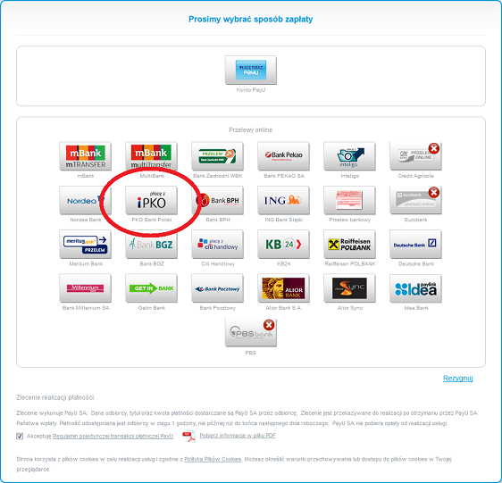 Aby dokonać płatności prosimy wybrać swój bank. System automatycznie przeniesie Cię do panelu logowania banku:
