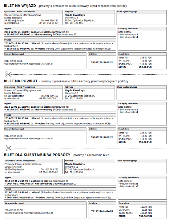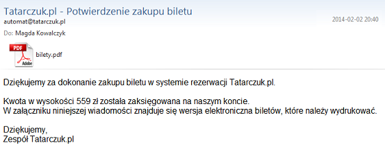 Po dokoniniu płatności, na podany w trakcie składania zamówienia adres e-mail zostanie wysłana wiadomość zawierająca plik PDF z zakupionymi biletami: